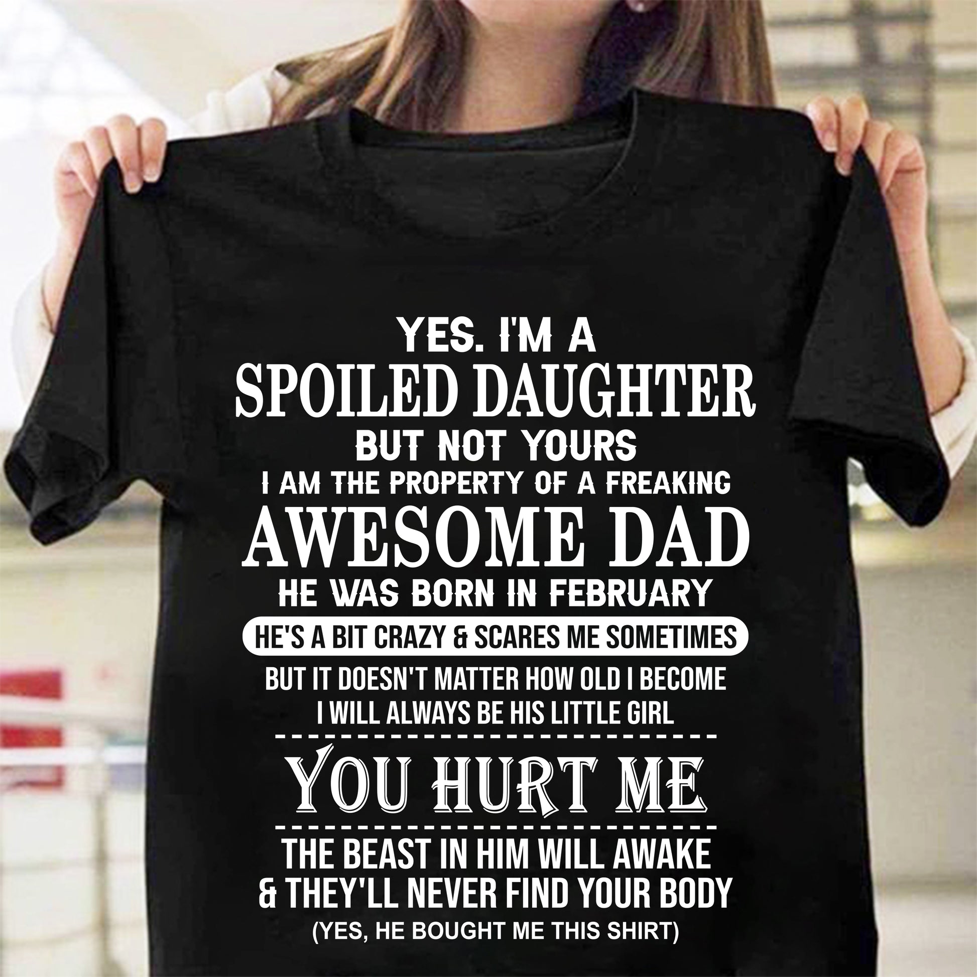 Yes I'm a spoiled daughter but not yours i am the property of a freaking awesome dad, he's a bit crazy & scares me sometimes, funny gift for dad, your little girl from daddy, single dad or stepped dad. A great idea gift for your daughter, gift for daughter from father.